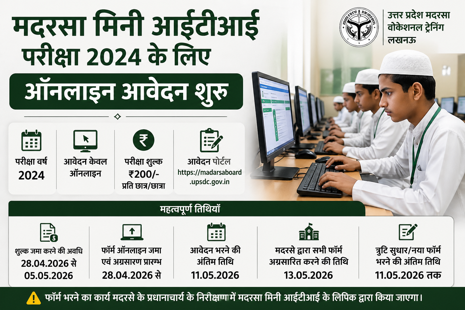उन्नाव- जिला समाज कल्याण अधिकारी एवं प्रभारी जिला अल्पसंख्यक कल्याण अधिकारी श्रीप्रकाश पाण्डेय ने बताया कि उ०प्र० मदरसा वोकेशनल ट्रेनिंग, लखनऊ द्वारा संचालित मदरसा मिनी आईटीआई परीक्षा वर्ष 2024 के लिए ऑनलाइन आवेदन प्रक्रिया शुरू हो गई है। आवेदन मदरसा पोर्टल https://madarsaboard.upsdc.gov.in� पर भरे जा रहे हैं। परीक्षार्थियों के लिए परीक्षा शुल्क ₹200 प्रति छात्र/छात्रा निर्धारित किया गया है, जिसे ट्रेजरी चालान के माध्यम से 28 अप्रैल 2026 से 05 मई 2026 के बीच जमा करना होगा। चालान की मूल प्रति सुरक्षित रखना अनिवार्य होगा। मदरसों द्वारा आवेदन पत्र प्राप्त करने के बाद निर्धारित शुल्क जमा होने पर 28 अप्रैल से ऑनलाइन फार्म भरने एवं अग्रसारित करने की प्रक्रिया शुरू कर दी जाएगी। आवेदन भरने की अंतिम तिथि 11 मई 2026 तय की गई है, जबकि मदरसा स्तर से सभी आवेदन 13 मई 2026 तक अग्रसारित किए जाएंगे। यदि आवेदन में कोई त्रुटि होती है, तो 11 मई तक उसे डिलीट या रिजेक्ट कर नया आवेदन भरा जा सकता है। वहीं, यदि आवेदन लॉक होकर अग्रसारित हो चुका है, तो जिला अल्पसंख्यक कल्याण अधिकारी के माध्यम से निर्धारित समय के भीतर उसे पुनः संशोधित कराया जा सकता है। यह आवेदन प्रक्रिया मदरसे के प्रधानाचार्य की देखरेख में मदरसा मिनी आईटीआई के लिपिक द्वारा पूरी की जाएगी। Post navigation उन्नाव में मुख्यमंत्री अभ्युदय निःशुल्क कोचिंग के लिए आवेदन शुरू, 25 मई तक करें पंजीकरण हसनगंज बार एसोसिएशन के नवनिर्वाचित पदाधिकारियों का शपथ ग्रहण संपन्न