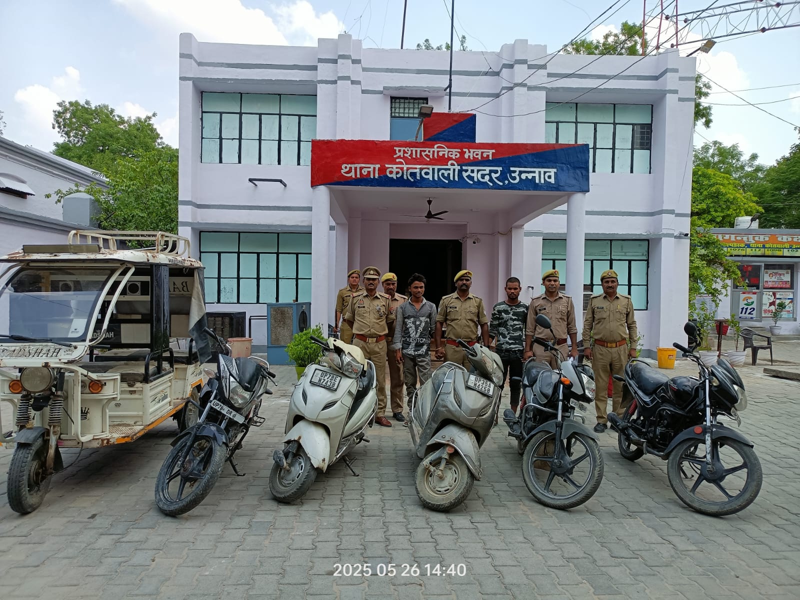 02 शातिर वाहन चोर गिरफ्तार, कब्जें से चोरी की 03 मोटरसाइकिल, 02 स्कूटी व एक ई-रिक्शा बरामद* श्रीमान पुलिस अधीक्षक महोदय जनपद उन्नाव के कुशल निर्देशन में अपराध एवं अपराधियों के विरुद्ध चलाये जा रहे अभियान के क्रम में थाना कोतवाली सदर पुलिस द्वारा चोरी की 03 मोटरसाइकिल, 02 स्कूटी व एक ई-रिक्शा बरामद कर 02 अभियुक्तगण को गिरफ्तार किया गया। संक्षिप्त विवरण– दिनांक 25.05.2025 को वादी मुकदमा जितेन्द्र सिंह पुत्र विजय पाल सिंह नि0 खजुरिया बाग थाना कोतवाली सदर उन्नाव की तहरीरी सूचना दी गई कि अज्ञात चोरो द्वारा वादी की स्कूटी रजिस्ट्रेशन नं0 यू0पी0 यूपी 35 ए0एन0 4258 कलर ग्रे को चोरी कर लिया गया है जिसके सम्बन्ध में थाना कोतवाली सदर पर मु0अ0सं0 0398/25 धारा 303(2) बीएनएस पंजीकृत किया गया। तथा वादी मुकदमा श्री कपिल कुमार पुत्र ओमप्रकाश नि0 अमरसस पो0 कोरारी कलां उन्नाव हाल पता कुद्दूखेडा थाना कोतवाली सदर उन्नाव की तहरीरी सूचना बावत अज्ञात चोरो द्वारा वादी की मोटर साइकिल यूपी 35 ए0सी0 3685 को चोरी कर ले जाने के सम्बन्ध मे मु0अ0सं0 0399/25 धारा 303(2) बीएनएस पंजीकृत किया गया था। दिनांक 25/26.05.2025 को रात्रि में प्रा0नि0 थाना कोतवाली श्री अवनीश कुमार मय हमराह पुलिस बल द्वारा संदिग्ध व्यक्ति/चेकिंग के दौरान पीडी नगर मोड़ से 100 मीटर अन्दर निराला नगर तिराहे पर 02 अभियुक्तगण 01.शिवा बाथम पुत्र गुड्डू बाथम नि0 ब्लाक न0 17 काशीराम कालोनी कमरा न0 13 थाना कोतवाली सदर उन्नाव उम्र 20 वर्ष 02. आर्यन पुत्र पप्पू राजपूत उम्र 19 वर्ष नि0 नबाबगंज गाँधीनगर थाना अजगैन जनपद उन्नाव को गिरफ्तार किया गया। जिनकी निशादेही पर 02 स्कूटी, 03 मोटरसाइकिल व 01 ई-रिक्शा बरामद किया गया । अभियुक्तगणों से गहनता से पूछताछ की गयी तो दोनो अभियुक्तो द्वारा बताया कि हम लोगो द्वारा यह वाहन जनपद उन्नाव व कानपुर के विभिन्न स्थानों से चोरी किये गये है तथा आज इन सभी वाहनों को बेचने के लिए जा रहे थे। अभियुक्तगण की गिरफ्तारी व बरामदगी के आधार पर थाना कोतवाली सदर पर मु0अ0सं0 400/25 धारा 317(2)/317(4)/317(5)बीएनएस पंजीकृत किया गया है। गिरफ्तार अभियुक्तों को माननीय न्यायालय के समक्ष पेश किया गया। गिरफ्तार अभियुक्तगण का विवरण- 01.शिवा बाथम पुत्र गुड्डू बाथम नि0 ब्लाक न0 17 काशीराम कालोनी कमरा न0 13 थाना कोतवाली सदर उन्नाव उम्र 20 वर्ष। 02. आर्यन पुत्र पप्पू राजपूत उम्र 19 वर्ष नि0 नबाबगंज गाँधीनगर थाना अजगैन जनपद उन्नाव। बरामदगी का विवरण- 1.स्पेलेण्डर आई स्मार्ट न0 UP 35 AC 3685 चेचिस न0 MBLHA12ACE9M03306 इंजन न0 HA12EME9M03074 2.पैशन प्रो न0 UP 35 S 4297 चेचिस नं0 MBLHA10EWBHN36575 इंजन नं0 HA10 ED BHL38083 3.मोटरसाइकिल ग्लैमर नं0 UP 78 DR 1694 के, चेचिस नं0 MBLJA06EGK02341 इंजन नं0 JA06EJEGK02956 4.स्कूटी UP 35 AN 4258 एक्टिवा चेचिस नं0 ME4JF507GH8109729 इंजन नं0 JF50E85109659 5.स्कूटी एक्टिवा UP78EN 7438 रंग सफेद चेचिस नं0 ME4JF505KGT863099 इंजन नं0 JF50ET3864262 6.ई रिक्शा जिसक