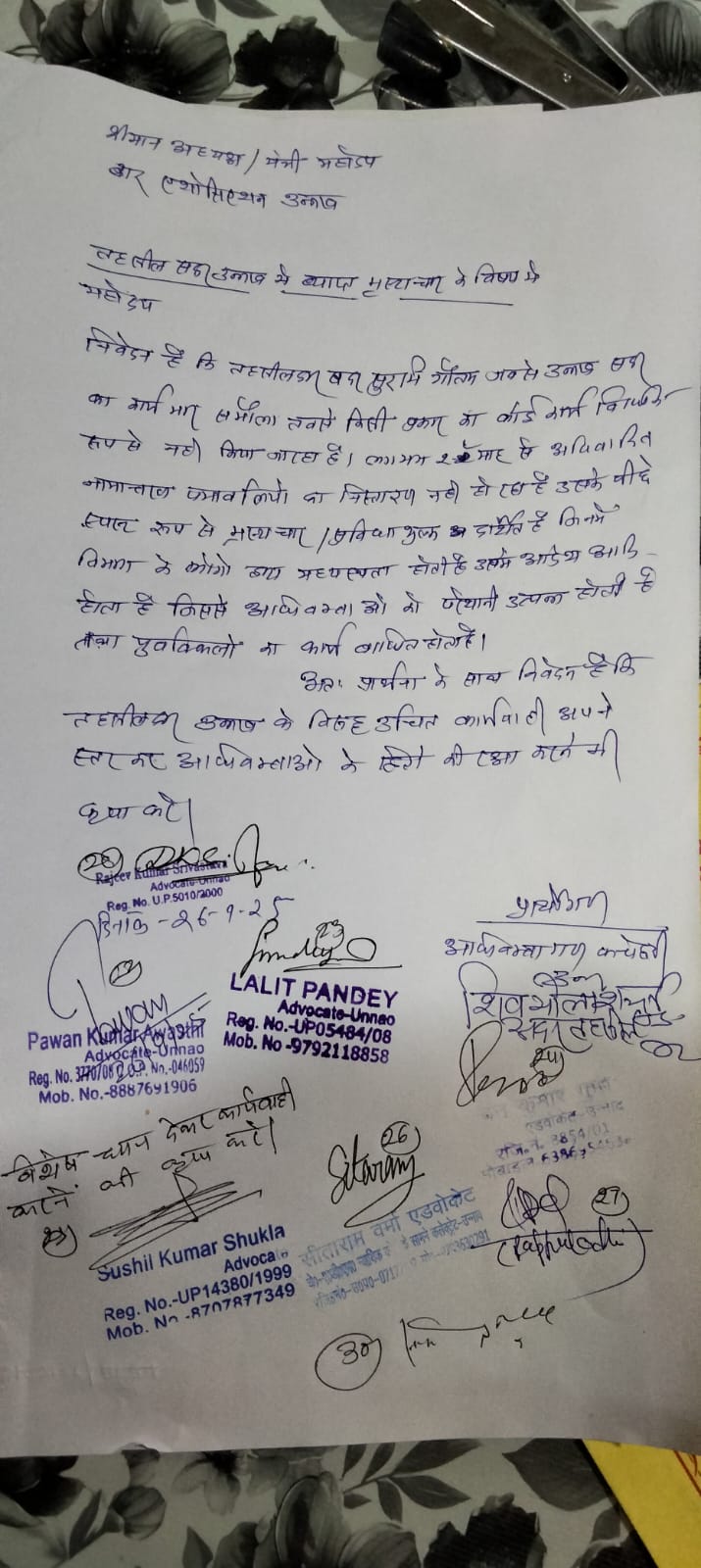 उन्नाव बार एसोसिएशन के अधिवक्ताओं में भारी आक्रोश देखने को मिल रहा है। जानकारी के अनुसार अधिवक्तागण तहसीलदार सदर सुरभि गौतम की कार्यशैली से नाराज हैं। आक्रोशित अधिवक्ताओं ने तहसील परिसर में धरना-प्रदर्शन की तैयारी शुरू कर दी है। अधिवक्ताओं का कहना है कि तहसीलदार की कार्यप्रणाली मनमानी और अधिवक्ताओं के हितों के प्रतिकूल है, जिसके चलते वे विरोध करने को बाध्य हुए हैं। उन्नाव बार एसोसिएशन के नेतृत्व में अधिवक्ताओं का यह विरोध प्रदर्शन जल्द ही तेज़ रूप ले सकता है। फिलहाल तहसील परिसर में माहौल तनावपूर्ण बना हुआ है। Post navigation राजकीय बालिका इंटर कॉलेज में मिशन शक्ति जागरूकता कार्यक्रम आयोजित RSS कार्यालय उद्घाटन समारोह में गूंजे सांस्कृतिक गौरव और विकास के संकल्प