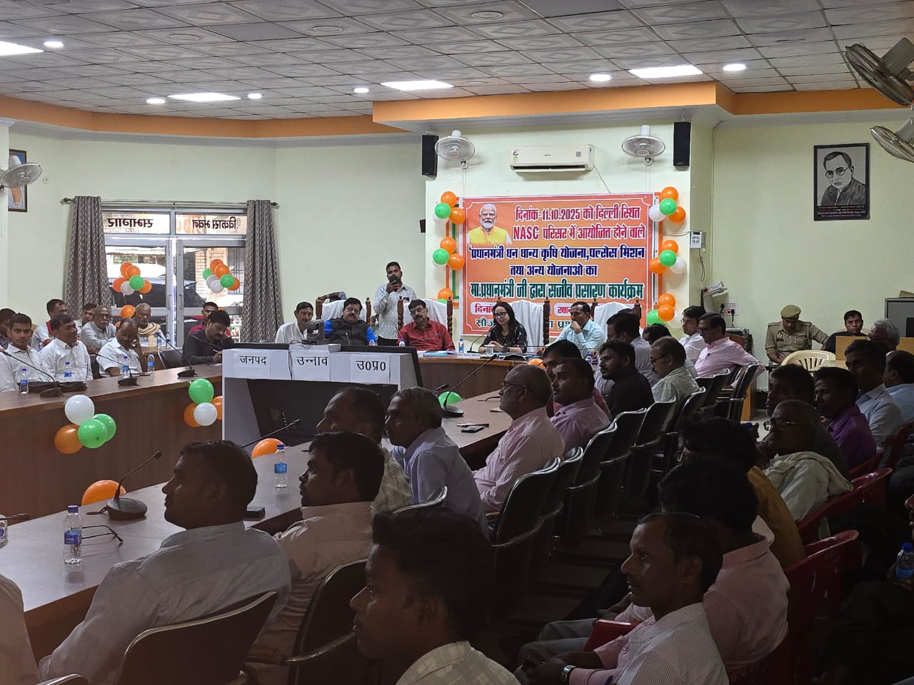 उन्नाव 11 अक्टूबर 2025 आज प्रधानमंत्री धन धान्य कृषि योजना का शुभारम्भ माननीय प्रधानमंत्री जी द्वारा पूसा नई दिल्ली से किया गया जिसका सजीव प्रसारण जनपद के सभी विकासखण्डो, ग्राम पंचायतो, प्रधानमंत्री किसान समद्धि केन्द्र, पैक्स सोसायटी, एग्रीकल्चर मार्केट पर किया गया। जनपदस्तर पर इसका सजीव प्रसारण विकास भवन सभागार मे किया गया जिसमे मुख्य अतिथि के रुप मे मा0 सदर विधायक श्री पंकज गुप्ता, विशिष्ट अतिथि मा0 जिला अध्यक्ष सहकारी बैक श्री अरुन सिंह, मण्डल अध्यक्ष श्री नूतन सिंह, मुख्य विकास अधिकारी सुश्री कृतिराज, अपर जिलाधिकारी वित्त एवं राजस्व श्री सुशील कुमार गौड़, जिला विकास अधिकारी श्री देव कुमार चतुर्वेदी, उप कृषि निदेशक श्री रवि चन्द्र प्रकाश, मुख्य पशुचिकित्साधिकारी श्री महावीर सिंह, मुख्य कार्यकारी अधिकारी मत्स्य श्री बाल किशोर दुबे एवं जनपद के लगभग 90 कृषको ने प्रतिभाग किया, जिसमे कृषि के साथ साथ पशुपालक एवं मत्स्य पालक कृषक भी उपस्थिति रहे। माननीय कृषि मंत्री महोदय से अभिभाषण से कार्यक्रम की शुभारम्भ किया गया। उनके के द्वारा अवगत कराया कि प्रधानमंत्री धन धान्य कृषि योजना के अन्तर्गत 42000 करोड़ रु0 से अधिक परियोजनाओ का संचालन किया गया जिसमे कृषि, पशुपालन, उद्यान, मत्स्य आदि विभागो की योजनाओ को राष्ट्रीय स्तर पर क्रियान्वयन किया जायेगा। इस परियोजनाओ के अन्तर्गत जनपद की उत्पादन एवं उत्पादकता को बछाने के लिये जनपद उन्नाव सहित उ0प्र0 के अन्य 10 जनपद को शामिल किया गया है। माननीय प्रधानमंत्री जी द्वारा अपने अभिभाषण के माध्यम से दलहन आत्मनिर्भरता मिशन पर जोर दिया गया तथा कैसे जनपद की उत्पादकताओ को बड़ाकर दलहन उत्पादन मे आत्मनिर्भर बन सके इस विषय पर विस्तृत चर्चा की। कार्यक्रम के समापन के अवसर पर कार्यक्रम मे सम्मिलित मा0 सदर विधायक श्री पंकज गुप्ता, विशिष्ट अतिथि मा0 जिला अध्यक्ष सहकारी बैक श्री अरुन सिंह, मण्डल अध्यक्ष श्री नूतन सिंह, मुख्य विकास अधिकारी सुश्री कृतिराज, अपर जिलाधिकारी वित्त एवं राजस्व श्री सुशील कुमार गौड द्वारा जनपद के ई लाटरी के माध्यम से चयनित कृषको को दलहन एवं तिलहनी फसलो के निःशुल्क बीज मिनीकिट जनपद के कृषक श्री रामगोपाल, श्री संजीव वर्मा, श्री राजकुमार,श्रीमती गायत्री सिंह तथा मत्स्य विभाग मे के0सी0सी0 एयरेशन सिस्टम,मुख्यमंत्री मत्स्य सम्पदा योजना, मछुआ दुर्घटना बीमा एवं एन0एफ0डी0पी0 के कृषक बबली, सुशीला, दिनेश, नन्हकऊ,शिव कुमार आदि को स्वीकृत पत्र/प्रमाण वितरण किये गये। इसके साथ ही पशुपालन विभाग मे कृत्रिम गर्भाधान क्षेत्र मे उत्कृष्ट कार्य करने के लिये जनपद के 20 पशुमित्र उत्तम कुमार, चन्द्र प्रकाश, लवकुश, धर्मेन्द्र, राजीव आदि को प्रमाण पत