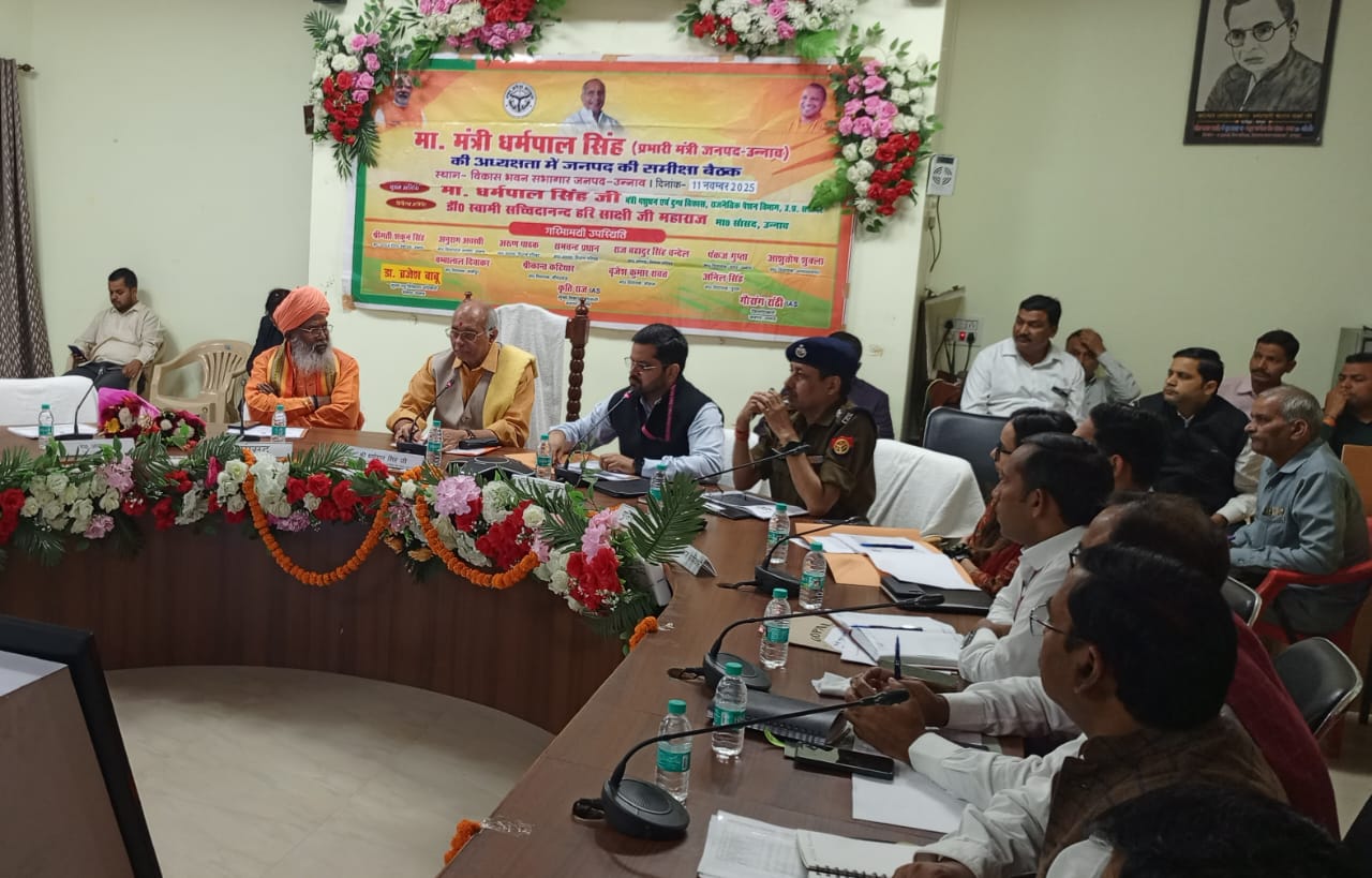 आज माननीय मंत्री पशु धन एवं दुग्ध विकास राजनीतिक पेंशन उत्तर प्रदेश / प्रभारी मंत्री उन्नाव श्री धर्मपाल सिंह जी की अध्यक्षता में माननीय सांसद उन्नाव डॉक्टर सचिदानंद हरि साक्षी जी महराज जी की उपस्थिति विकास भवन सभागार में विकास कार्यों एवं कानून व्यवस्था के सम्बंध समीक्षा वैठक आयोजित की गई। इस अवसर पर माननीय प्रभारी मंत्री जी द्वारा किसानों को खाद बीज वितरण, विद्युत वितरण , बाढ़ के समय में हुए फसलों और सड़कों के नुकसान गौशालाओं में गौ वंश के रखरखाव,व गंभीर अपराधों पर प्रभावी रोकथाम और कार्यवाही सहित अन्य महत्वपूर्ण विन्दुओ के सम्बंध में समीक्षा की गई। माननीय मंत्री जी ने निर्देशित करते हुए कहा कि अवस्थापना के संबंध में जो विभागों को बजट आवंटित हुआ है उसको सतप्रतिशत सदुपयोग कर लिया जाए । अधिशासी अभियंता पी डब्ल्यूडी को निर्देशित करते हुए कहा कि जो मार्ग बाढ़ से क्षतिग्रस्त हुए हैं उनको प्राथमिकता के साथ समय से ठीक करा दिया जाए । माननीय मंत्री जी ने कहा कि सहकारी समितियां में खाद की उपलब्धता अवश्य रहे किसानों को समय से खाद मिल जाए यह सुनिश्चित करें इसी प्रकार किसानों को सोसाइटी के माध्यम से बीज का वितरण समय से हो जाए । किसानों को उन्नतशील बीजों का वितरण अवश्य किया जाए जो प्रजातियां कम समय में उत्पादन अधिक दे रही हैं उनको उपलब्ध कराया जाए। जिला कृषि अधिकारी किसानों को जैविक और कम्पोष्ट खाद के प्रति जागरूक करें । नकली खाद, और खाद की उपलब्धता के सम्बंध जिलाधिकारी श्री गौरंग राठी जी ने माननीय मंत्री जी को आश्वस्त करते हुए कहा कि जनपद में नकली खाद पर प्रभावी कार्यवाही की गई है और किसानों को प्राथमिकता के साथ डीएपी और NPK उपलब्ध कराया जा रहा है जनपद में खाद की कोई समस्या नहीं है। माननीय मंत्री जी ने मुख्य पशु चिकित्सा अधिकारी को निर्देशित करते हुए कहा कि जनपद में गोवंश का रखरखाव ठीक ढंग से हो बीमार होने पर इलाज समय से मिलता रहे जो पशु बाहर टहल रहे हैं उनको अभियान चलाकर संबंधित गौशाला में संरक्षित करें। कह की देसी नस्ल की गायों के पालन के लिए पशुपालकों को प्रेरित करें । क्रत्रिम गर्भाधान पर जोर दें नस्ल सुधार पर कार्य करें और गौशालाओं को आत्म निर्भर बनाएं। जिला पूर्ति अधिकारी को निर्देशित करते हुए कहा कि खाद्यान्न का वितरण ठीक ढंग से कराया जाए जो दुकान निलंबित हैं उनका प्रस्ताव कर दुकान आवंटित किया जाए । मंत्री जी ने कहा कि जनपद में नकली दूध और खोया पर अभियान चला कर चेकिंग किया जाए। अधिशासी अभियंता विद्युत को निर्देशित करते हुए कहा कि ग्रामीण और शहरों में विद्युत आपूर्ति का जो निर्धारित समय है उसके अनुसार विद्युत की सप्लाई किया जाए। खराब ट्रांसफार्मर समय से बदल दिया जा