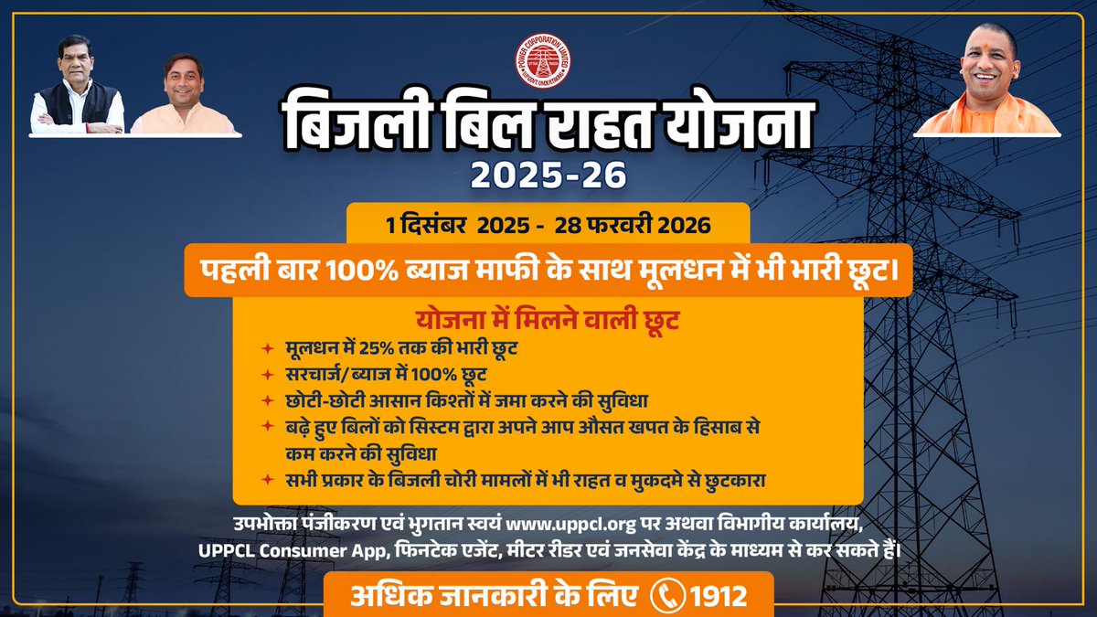 विद्दुत बिल राहत योजना 2025-26 में भारी छूट के साथ उपभोक्ता पाएं लाभ घरेलू कनेक्शन के 02 किलोवाट भार एवं वाणिज्यिक के 01 किलोवाट स्वीकृत भार तक के बकायेदार विद्दुत उपभोक्ताओं को मिलेगा लाभ उपभोक्ता 100 प्रतिशत व्याज माफी के साथ मूलधन में भी 25 प्रतिशत की छूट के साथ रुपये 500 एवं 750 जैसी छोटी छोटी किस्तों में भुगतान की सुविधा का लें लाभ सभी प्रकार के बिजली चोरी मामलों में ७० प्रतिशत तक की छूट एवं मुकदमें से मिलेगा छुटकारा अधीक्षण अभियंता विद्दुत श्री अमिय कुमार सिंह ने विद्दुत बिल राहत योजना 2025-26 के सम्बंध में जानकरी देते हुए बताया कि घरेलू कनेक्शन के 02 किलोवाट भार तक एवं वाणिज्यिक विधा के 01 किलोवाट स्वीकृत भार तक के बकायेदार विद्दुत उपभोक्ताओं को राहत पहुंचाने के लिए बिजली बिल राहत योजना 2025-26 को तीन चरणों मे लागू किया गया है जिसमें उपभोक्तता भारी छूट पाकर लाभ प्राप्त कर सकते हैं। बताया कि पहली बार १०० प्रतिशत व्याज माफी के साथ मूलधन में भी 25 प्रतिशत एक की अतिरिक्त छूट दी गई है। बताया कि इसमे रुपये 500 एवं 750 जैसी छोटी -छोटी किस्तों में भुगतान की सुविधा दी गयी है साथ ही सभी प्रकार के बिजली चोरी मामलों में ७० प्रतिशत तक की छूट एवं मुकदमें से छुटकारा दिया गया है । बताया कि योजना में अधिकतम 02 किलोवाट घरेलू, और वाणिज्यिक के अधिकतम एक किलोवाट तक के उपभोक्ता पात्र होंगे। बताया कि योजना का लाभ लेने के लिए पात्र उपभोक्ताओं को सर्वप्रथम ₹2000 का भुगतान कर अपना पंजीकरण कराना होगा । जिस चरण की अवधि में उपभोक्ता द्वारा भुगतान किया जाएगा उसमें ही पात्र माना जाएगा । बताया कि इसके लिए नजदीकी खंड उपखंड कार्यालय अथवा उप केंद्र पर बने कैश कलेक्शन काउंटर, प्रतिदिन लगाए जाने वाले विभागीय कैम्पों मे जाकर जन सेवा केंद्र के माध्यम से मी रीडरों को भी डोर टू डोर पंजीकरण कराने की सुविधा दी गई है। इसी प्रकार विद्युत सखियों के माध्यम से या विभाग की वेबसाइट www.uppcl.org के माध्यम से घर बैठे उपभोक्ता ऑनलाइन रजिस्ट्रेशन कर सकते हैं। बताया जनपद उन्नाव में कुल 2.75 लाख उपभोक्ता योजना हेतु पात्र हैं जिन पर कल 347.67 करोड़ का मूलधन एवं 185 .71 करोड़ का सरचार्ज बकाया है। घरेलू श्रेणी के कुल दो पॉइंट 72.72 लाख उपभोक्ता पात्र श्रेणी में है जिन पर कुल 250.50 करोड़ का मूलधन एवं 180.60 करोड़ का सरचार्ज बकाया है। वाणिज्य श्रेणी के कुल 3274 उपभोक्ता पात्र श्रेणी में है जिन पर कुल 97. 17 करोड़ का मूलधन एवं 5.11 करोड़ का सर चार्ज बकाया है। अधीक्षण अभियंता ने सभी विद्युत पात्र उपभोक्ताओं से अनुरोध के साथ निवेदन किया है कि वह अपने नजदीकी उपकेंद्र उपखंड अथवा खंड कार्यालय अथवा ऑनलाइन विभाग की वेबसाइट के माध्यम से जल्द से जल्द अपना पंजीकरण कराकर योजना का लाभ उठाते हुए अपनी बकाया 