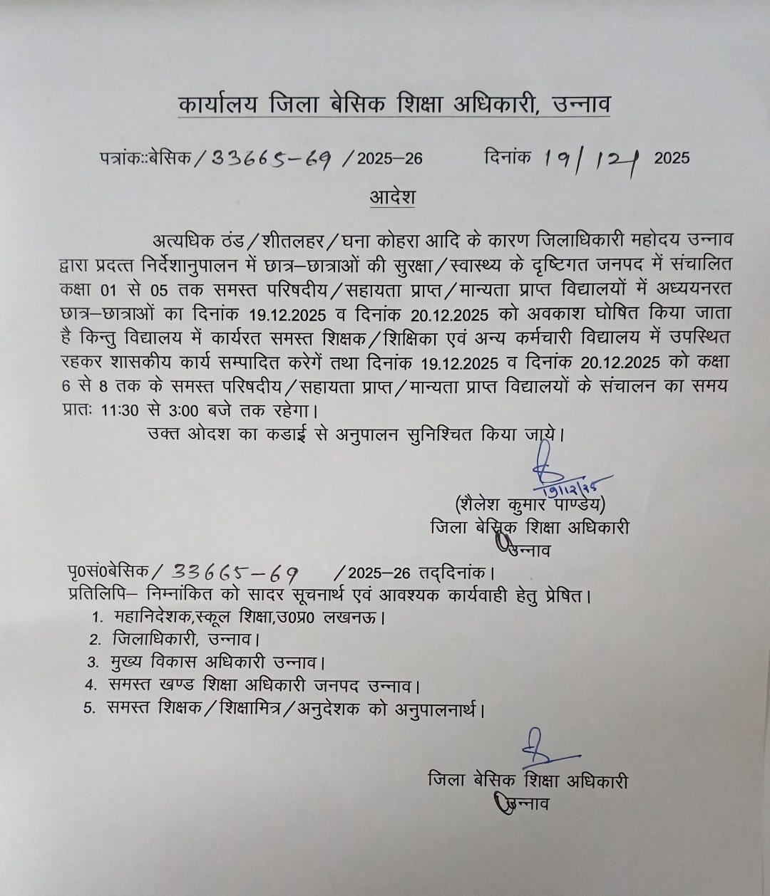 उन्नाव- जिलाधिकारी महोदय द्वारा दिए गए निर्देशों के क्रम में जनपद उन्नाव के समस्त परिषदीय, सहायता प्राप्त एवं मान्यता प्राप्त विद्यालयों में कक्षा 1 से 5 तक के विद्यार्थियों के लिए अवकाश घोषित किया गया है। वहीं कक्षा 6 से 8 तक के विद्यालयों का संचालन अग्रिम आदेश तक परिवर्तित समय के अनुसार किया जाएगा। इन कक्षाओं के लिए विद्यालय का समय प्रातः 11:30 बजे से अपराह्न 3:00 बजे तक निर्धारित किया गया है। — जिला बेसिक शिक्षा अधिकारी, उन्नाव Post navigation पुलिस अधीक्षक ने थाना बीघापुर का किया वार्षिक निरीक्षण पुलिस अधीक्षक उन्नाव की अध्यक्षता में ग्राम प्रहरियों की महत्वपूर्ण गोष्ठी आयोजित