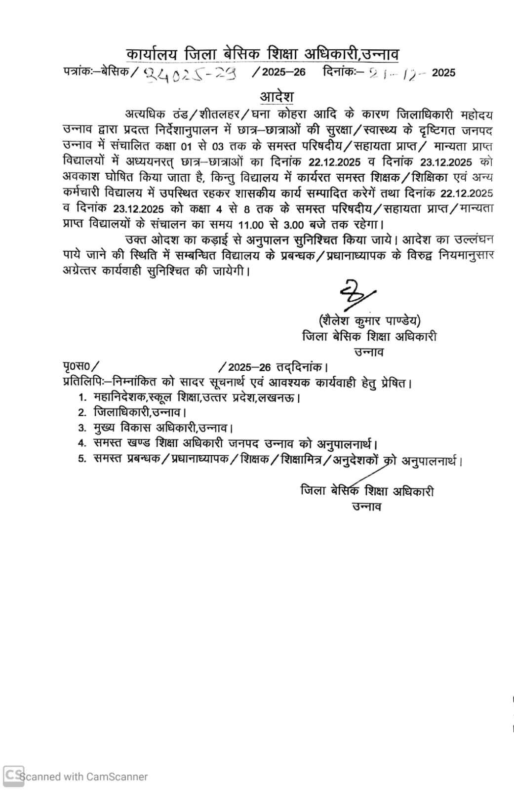 बेसिक विद्यालयों एवं सहायता प्राप्त/ मान्यता प्राप्त विद्यालयों में 22 एवं 22 एवं 23 दिसंबर 2025 को रहेगा अवकाश जिला बेसिक शिक्षा अधिकारी शैलेश पांडे ने जारी किया आदेश… Post navigation पुलिस अधीक्षक उन्नाव की अध्यक्षता में हुई मासिक अपराध गोष्ठी मगरवारा ग्राम चौपाल: पात्रों को योजनाओं से जोड़ने के डीएम ने दिए निर्देश