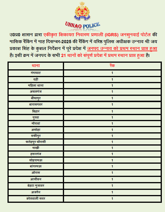 उन्नाव– उ0प्र0 शासन द्वारा एकीकृत शिकायत निवारण प्रणाली (IGRS) जनसुनवाई पोर्टल की मासिक रैंकिंग में माह दिसम्बर-2025 की रैंकिंग में वरिष्ठ पुलिस अधीक्षक उन्नाव श्री जय प्रकाश सिंह के कुशल निर्देशन में पूरे प्रदेश में जनपद उन्नाव को प्रथम स्थान प्राप्त हुआ है। इसी क्रम में जनपद के सभी 21 थानों को संपूर्ण प्रदेश में प्रथम स्थान प्राप्त हुआ है। Post navigation वरिष्ठ पुलिस अधीक्षक उन्नाव ने थाना पुरवा का किया वार्षिक निरीक्षण विशेष प्रगाढ़ पुनरीक्षण अभियान 2026 को लेकर उन्नाव में समीक्षा बैठक, आयुक्त ने कार्यों की सराहना की